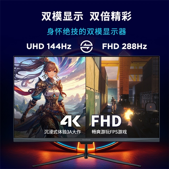 VX27G63-4K的最大亮点之一是其支持UHD 144Hz与FHD 288Hz双模显示,用户可根据使用场景一键切换模式,兼顾画质与流畅度。UHD模式下,显示器提供3840×2160超清分辨率与144Hz刷新率,适合画质要求极高的游戏与影视内容;而在FHD模式下,刷新率提升至288Hz,为FPS、MOBA等高速竞技类游戏提供更顺滑的操作体验。