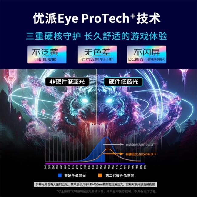 VX27G63-4K搭载优派新一代Eyes ProTech+硬件护眼方案,结合DC调光不闪屏,有效缓解视觉疲劳与蓝光伤害。硬件低蓝光通过优化光谱输出,在不影响色彩表现的前提下降低有害蓝光比例;不闪屏技术则通过DC调光方式消除频闪,提升观看舒适度。